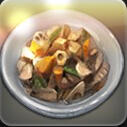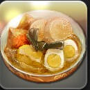 A cornucopia of sliced and boiled Potatoes, Lotus Root, Carrot, and Burdock root, accompanied with the juiciest chicken thighs on top!